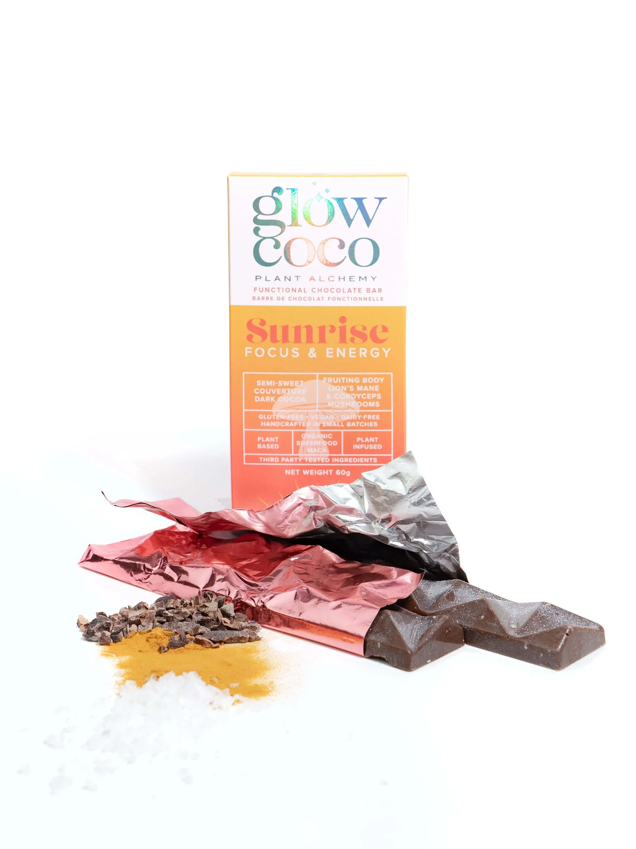Sunrise artisanal functional chocolate bars are culinary crafted using couverture 100% plant based vegan “mylk” chocolate, made with Chufa, a nutritious tuber.